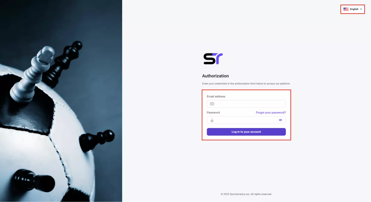 To start using the Sportematica platform, log into your account through the Authorization page at sportematica.ws/auth/sign-in. Begin by selecting your preferred interface language in the upper right corner of the page.